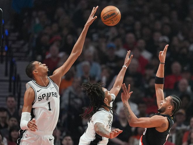 第一节比赛,阿夫迪亚、卡马拉4-0,卡斯尔三分,卡马拉三分,开拓者7-3,文班、卡斯尔、福克斯9-0反超5分,暂停回来阿夫迪亚、克林根合砍4分,瓦塞尔、卡斯尔合砍4分,马刺领先5分,夏普、罗威、格兰特追平分差,文班三分+福克斯中投,马刺领先5分,格兰特、夏普、穆雷9-0反超4分,文班空接,首节战罢开拓者25-23领先。
