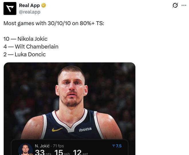 同时本场比赛也是约基奇生涯第10次以至少80%真实命中率砍下30+三双,NBA历史断档第一,张伯伦4次排在第二,东契奇2次排在第三。